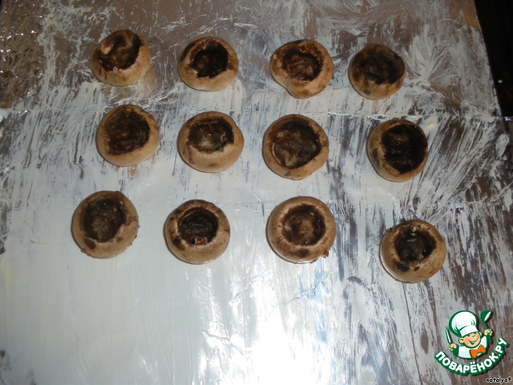 Вырезать ножки у шампиньонов и выложить на противень (фольгу), смазанный маргарином.