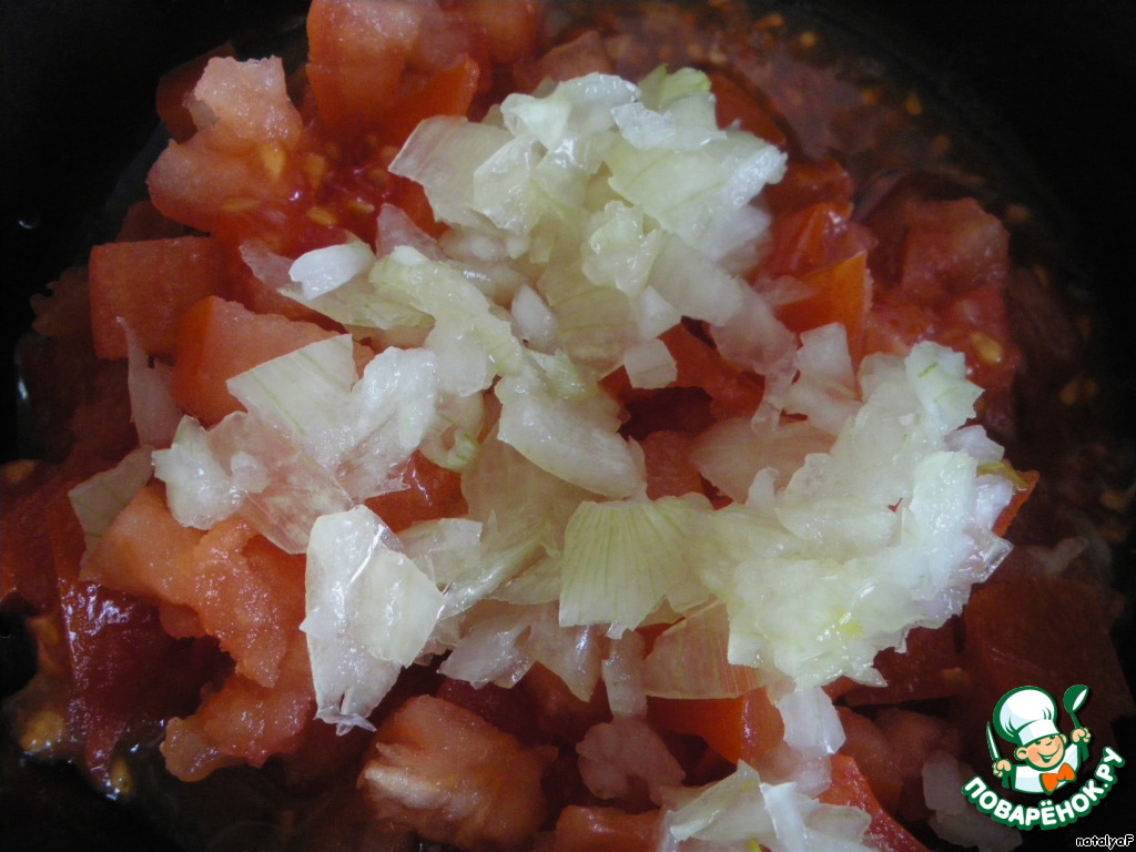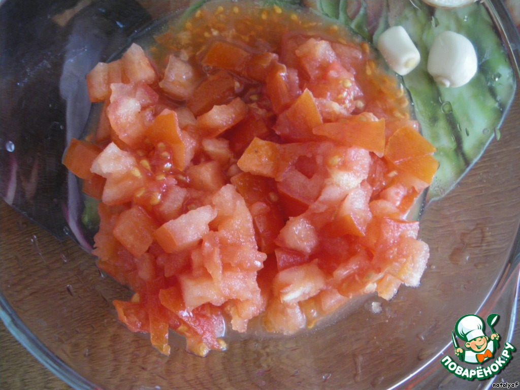 Необходимо взять глубокую посуду и очень мелко нарезать в нее помидоры