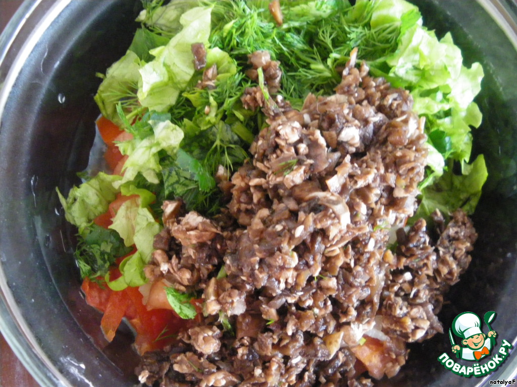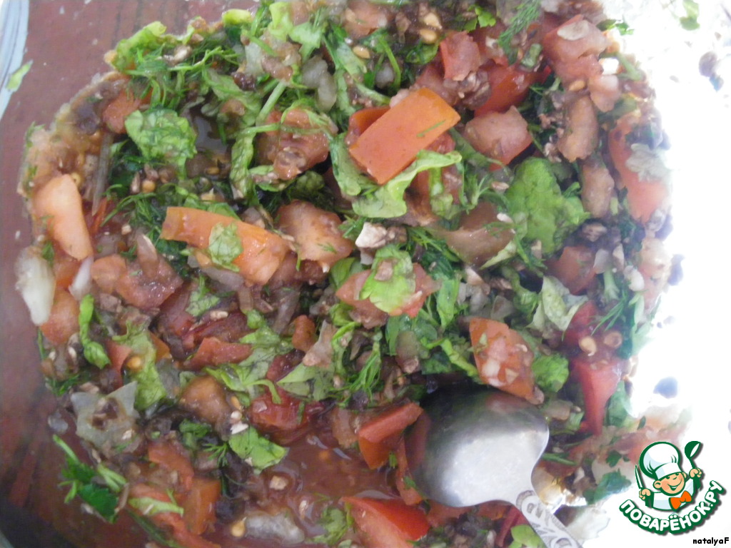 Засыпать соль, часть зелени и вылить ложку растительного масла