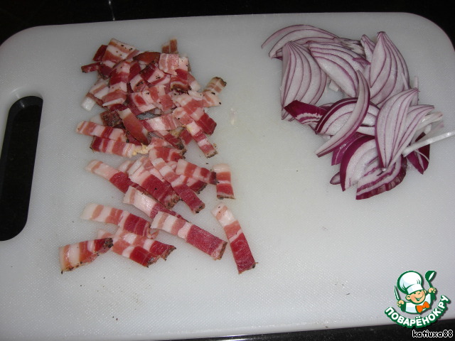 Нарезаем лук полукольцами,а бекон - толстой соломкой.