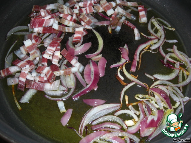 В разогретую сковороду с маслом выложить лук и обжарить до мягкости. Добавить бекон, обжарить несколько минут до золотистого цвета.