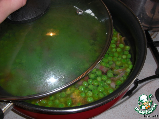 Затем добавить горошек, залить водой и тушить под крышкой 20-25 минут, периодически помешивая.