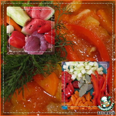 | Пришла в голову идея приготовить блюдо в горшочках на арбузно-кабачковой заливке :) Очень люблю экспериментировать :) И хочу сказать, мне это удалось :) Получилось необычайно вкусно!!! Выставляю рецепт приготовления для конкурса " Осеннее танго " |