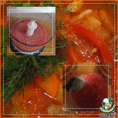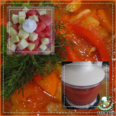 готовим заливку: из арбуза удалили косточки и, порезав кусочками, поместили в блендер, добавили к нему вторую половину кабачков и взбили всё в блендере