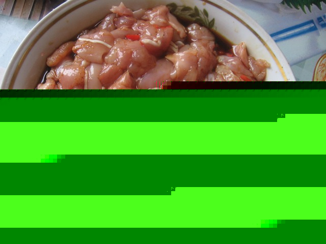 Мелко нарезаем мясо, ободранное с ножек, и маринуем его с соевым соусом, специями и мелко нарезанной половинкой перчика чили.