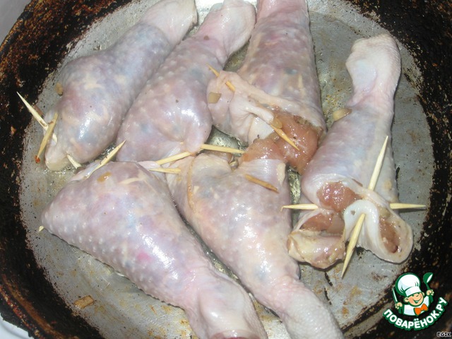 Смешиваем обжаренные грибы с луком и маринованную курочку (маринад аккуратно слить отдельно, еще понадобится :-) ) и нафаршировать ножки (как уж получится), закрепив их зубочистками.