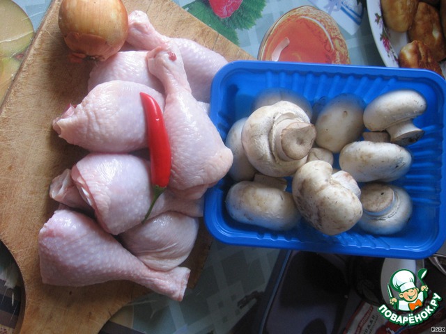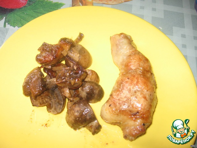 Выложить ножки на противень вместе с крупно порезанными шампиньонами. Грибы полить оставшимся маринадом от курочки и запекать до готовности.