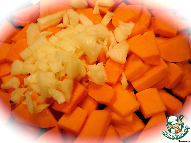 Затем перекладываем тыкву и мелко порезанный лук в сковороду с оставшимся после бекона жиром. Тушим до мягкости тыквы (на это уйдет минут 10).