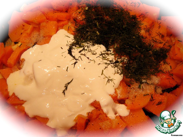 После этого добавляем сметану, укроп, соль и перец, хорошо перемешиваем и тушим еще минуту.