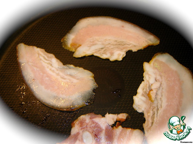Ломтики бекона или грудинки поджариваем с двух сторон на сковороде без масла, пока кусочки не станут сухими и хрустящими. Снимаем их со сковороды и откладываем на время.