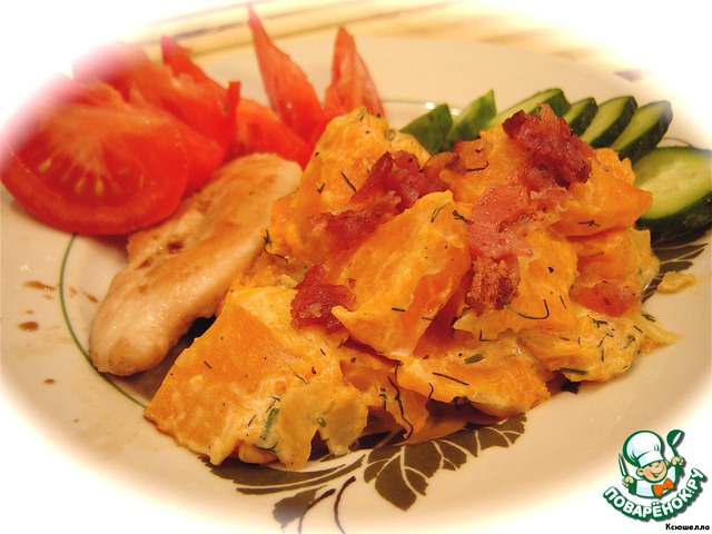 Теперь раскладываем по тарелкам и посыпаем каждую порцию раскрошенным на мелкие кусочки беконом. Вот так все быстро и просто! Приятного аппетита!