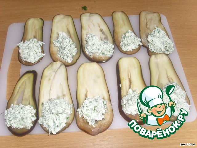 Кладём начинку на баклажан и заварачиваем.
