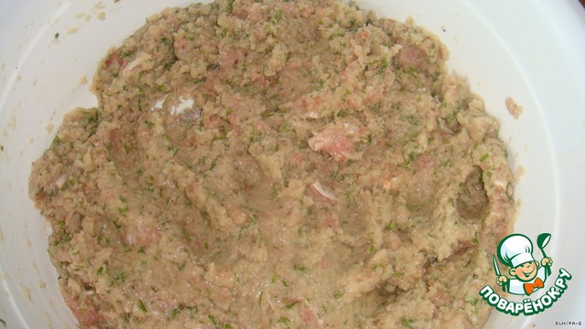 Приготовить фарш (можно чисто мясной) А я смещиваю фарш, картошку (котороя осталась от серединок) лук, специи, зелень.