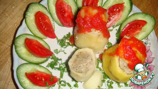 Начинить фаршем картофель и накрыть картофель срезанными "крышками", положить всё в кастрюлю, воду налить на два пальца выше дна и поставить на слабый огонь. Если у вас останется фарш, можно зафаршировать сладкий перец.