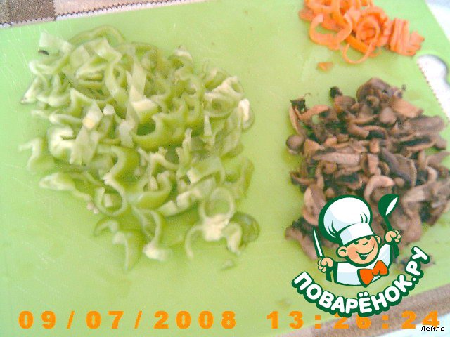 За это время нарезать полосками болгарский перец, морковь(от карвинга у меня,остатки), обжарить, положить 1 помидорку (без кожицы).