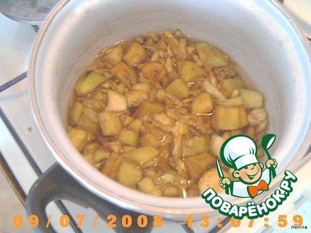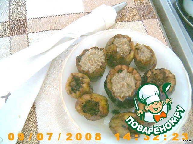 Во внутрь баклажан кладем грибы. Затем пюре из мякоти баклажан кладем в мешочек с насадкой и заполняем баклажаны.