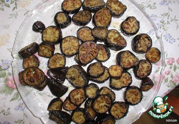 Баклажаны разрезать кружочками толщиной в 1,5 см. Посолить как следует и дать отстояться часик. Должен выйти горький сок.