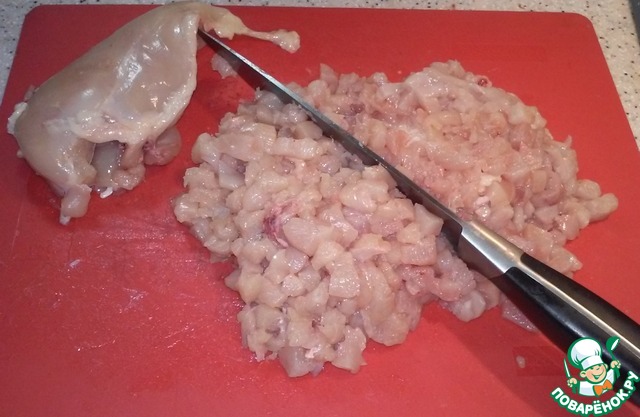 Вымытое и высушенное бумажным полотенцем куриное филе режем мелким кубиком. Складываем в миску.