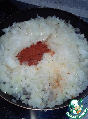 Разогреваем на сковородке ложку растительного масла и отправляем туда лук. Посыпаем 1/2 ч. л. паприки и чуть чили. Если будут кушать детки, чили не кладем. Пассеруем пару минут до мягкости лука.