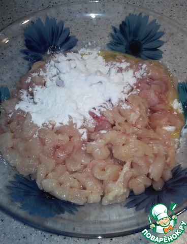 Добавляем в яйцо курицу и крахмал. Перемешиваем.