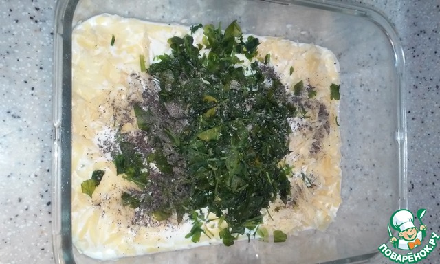 Мелко порезанные листики петрушки добавляем в сыр со сливками, чуть присолим и поперчим.