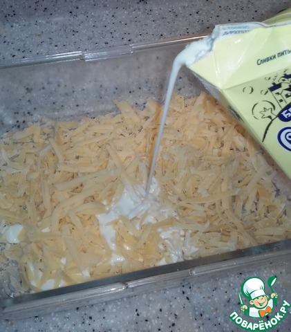 Пока тефтели запекаются в духовке готовим заливку. Натрем сыр на крупной терке, добавим в него сливки.