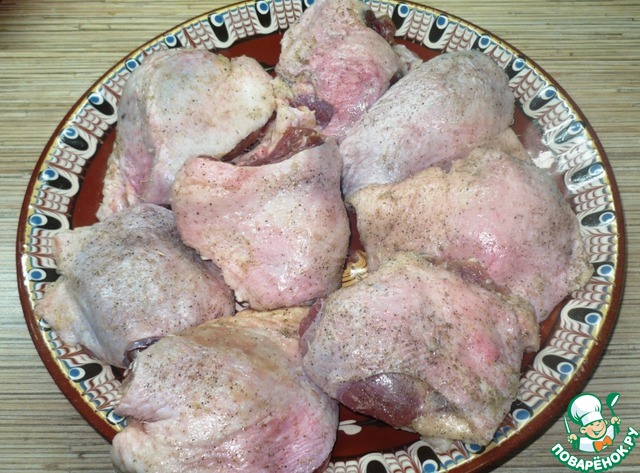 Утиные ножки хорошо вымыть, обсушить бумажным полотенцем. Натереть солью с перцем. Вообще по рецепту идут утиные окорочка, но почему-то в упаковке с надписью "Утиные окорочка" оказались бедра.