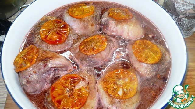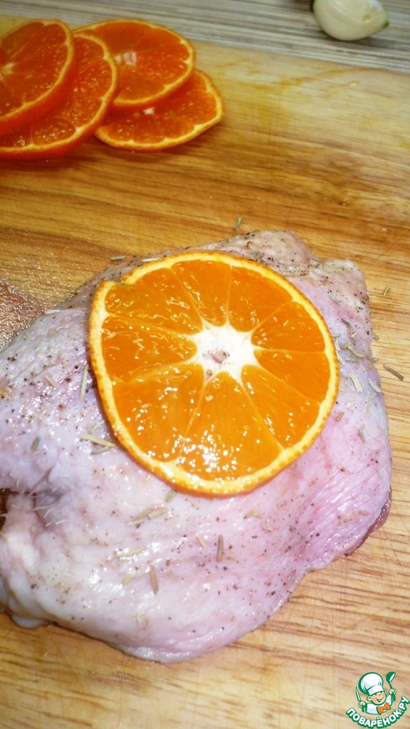2 мандарина порезать кружочками, не очищая и положить на розмарин. Привязать кулинарной нитью.