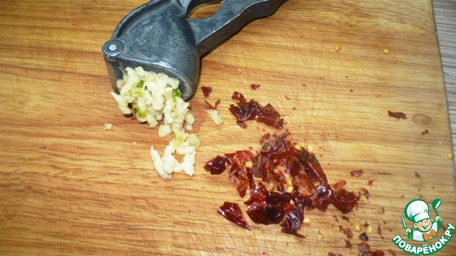 Чеснок почистить, выдавить с помощью пресса. Перец чили мелко порезать. Я использовала сухой чили.