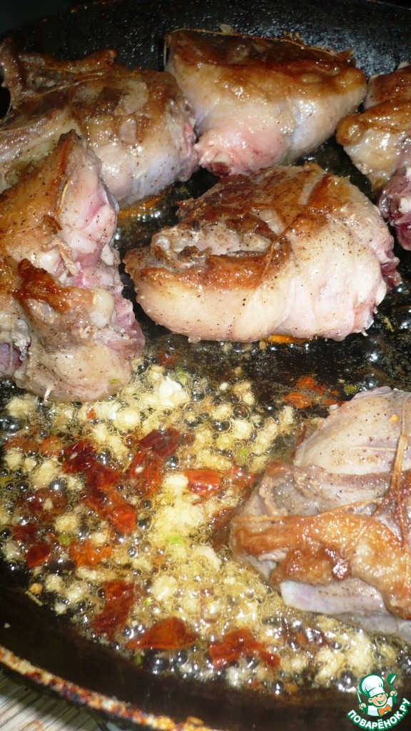 Разогреть на сковороде масло, жарить утиные бедра по три минуты с обеих сторон. Добавить чеснок и перец чили. В огнеупорную форму для выпекания выложить обжаренные утиные ножки.