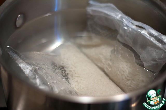 В подсоленную кипящую воду опустить два пакетика риса, варить на медленном огне 15 минут. По окончании варки, достать пакетики и дать стечь воде.