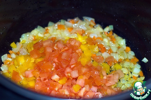 Залить протертой томатной массой, разбавленной с водой. Тушить 12 минут. Отрегулировать вкус солью, черным перцем.