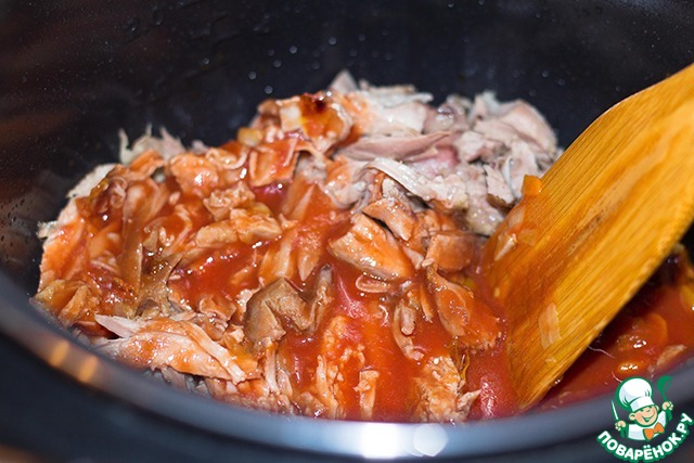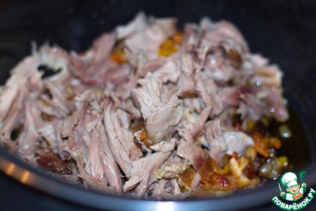 | Это блюдо требует предварительной подготовки накануне, или же готовится из мяса утки/индейки, оставшихся, например, после праздничного стола (Новогоднего ужина). Поверьте, получается вкусно, сытно, и пикантно, стоит затрат времени, ведь полученное удовольствие от поедания - гораздо ценнее. |