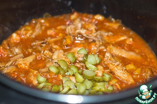 За 3 минуты до окончания тушения добавить нарезанные маринованные огурцы (корнишоны). Перемешать.