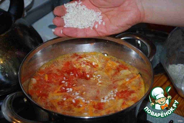 Высыпаем 3 горстки риса. Закрываем крышкой и варим на среднем огне минут 15. Пробуем на соль (рис любит соль). Если надо - досаливаем. И варим еще минут 5 до готовности риса.
