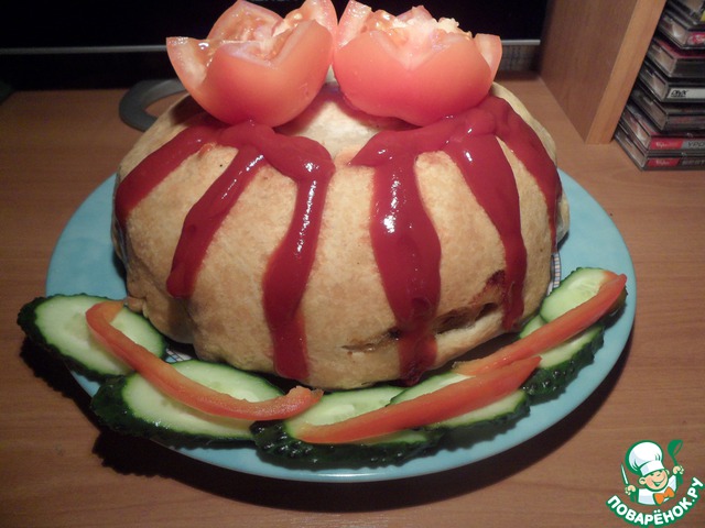 Переворачиваем из формы и украшаем кетчупом и овощами.