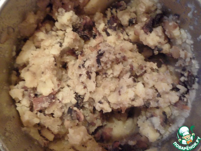 Сварить картофель, пожарить 1 лук с грибами, все соединить, добавив 100г. молока и 100г. сливочного масла.