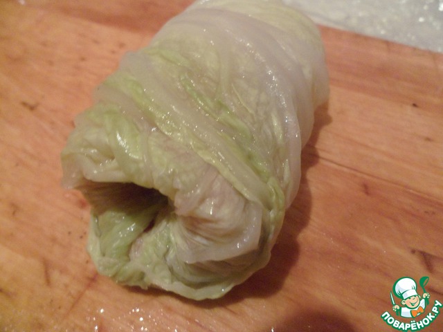 Завернуть 9 листьев китайской капусты в пищевую пленку и поставив на максимальную температуру в микроволновку на 5 минут запекать. Вынуть и остудить в пленке.