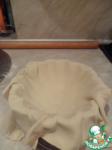 Раскатать 200г. слоеного бездрозжевого теста. Выложить в смазанную форму тесто.