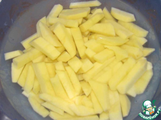 Картофель очистить и нарезать крупной соломкой. Положить в миску с холодной водой, чтобы удалить лишний крахмал.