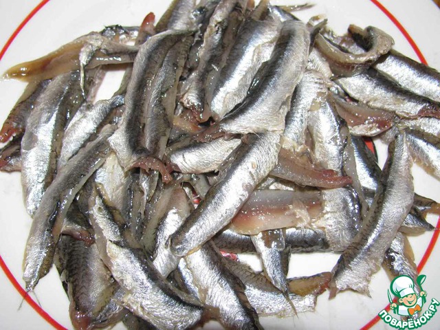 Анчоусы разделить на 2 части. Маринад от анчоусов сохранить! У меня использовалась хамса малосольная, поэтому я брала больше чем 10 шт.