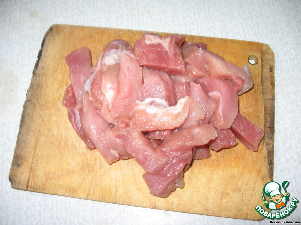 2. Мясо режем брусочками, солим, перчим по вкусу