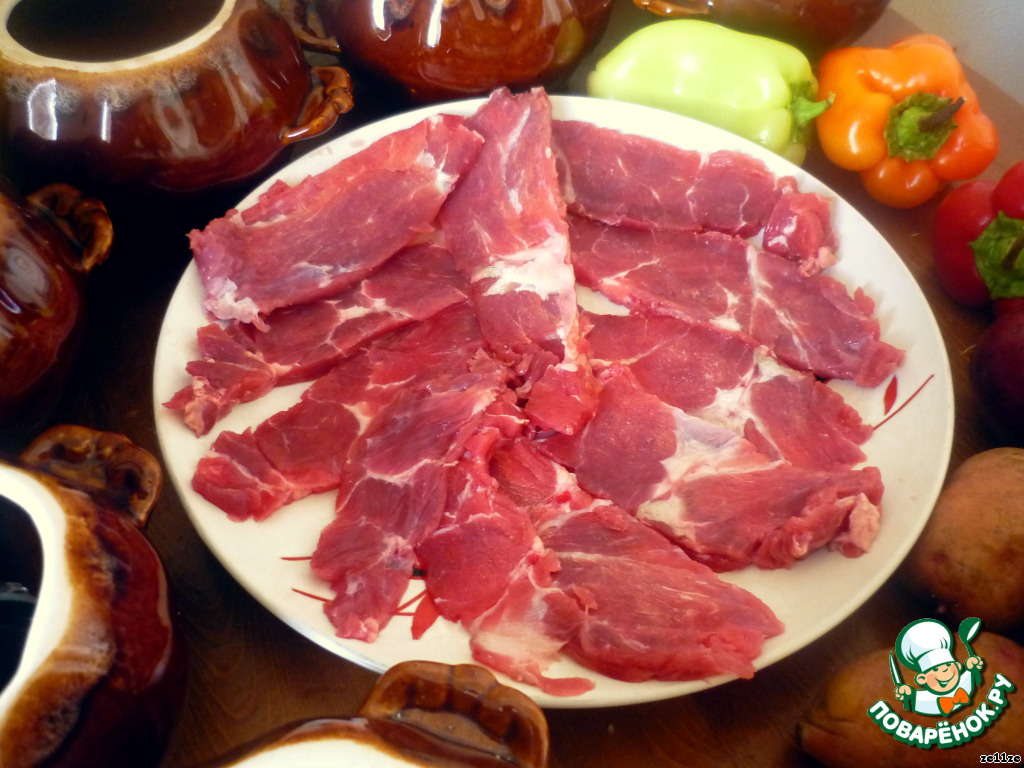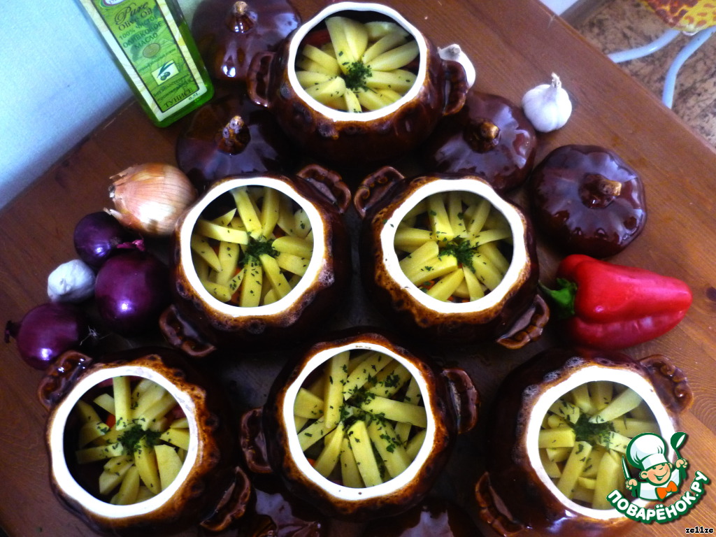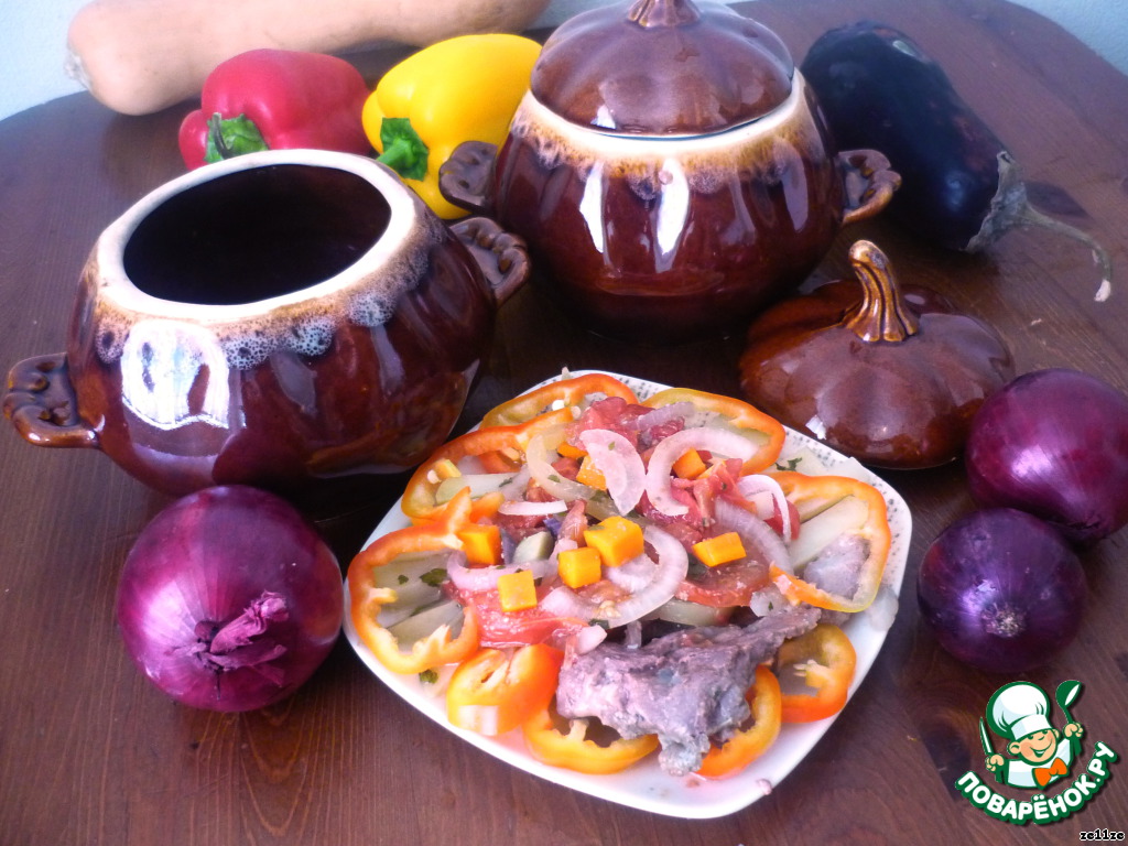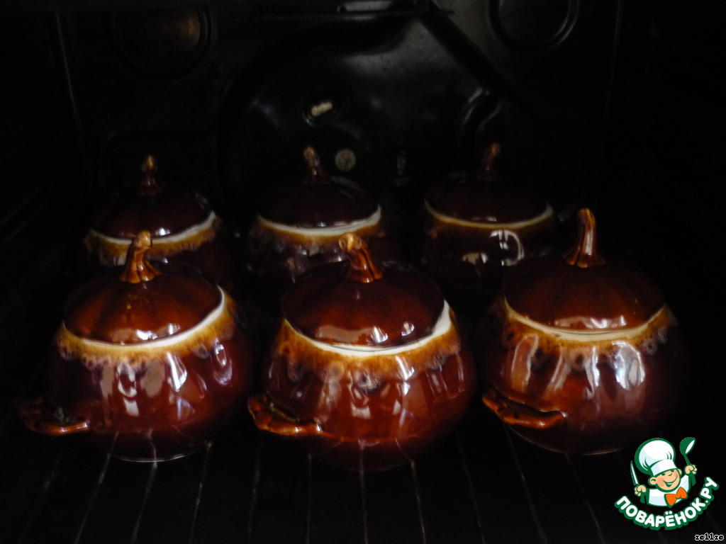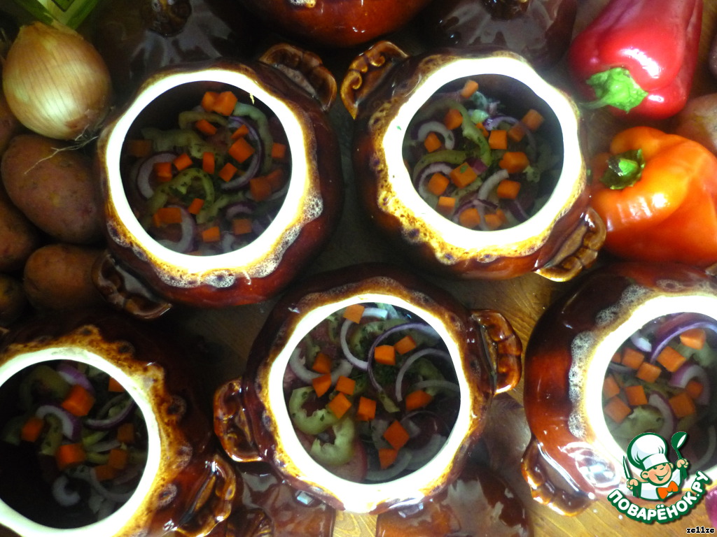 разложить по горшочкам и замариновать на 30 минут в тонких ломтиках помидоров. Добавить лук и болгарский перец, нарезанные полукольцами.