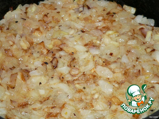 На другой сковороде тем временем поджарить лук с чесноком до зарумянивания.