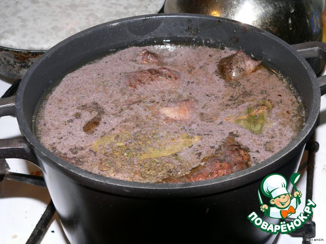 Мясо порезать крупными кусками и замариновать в красном сухом вине с добавлением лаврового листа, черного и душистого перца (по 5-6 горошин), сухих прованских трав (1 ч.ложка), гвоздики (5-6 бутончиков). У меня мокло сутки. Затем маринад слить в отдельную емкость. Ни в коем случае не выливать!!!!