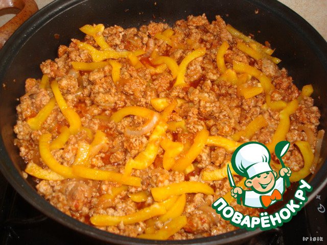Затем добавляем томатную пасту и болгарский перец. Все хорошо перемешиваем, солим, перчим и оставляем хорошо потушиться.