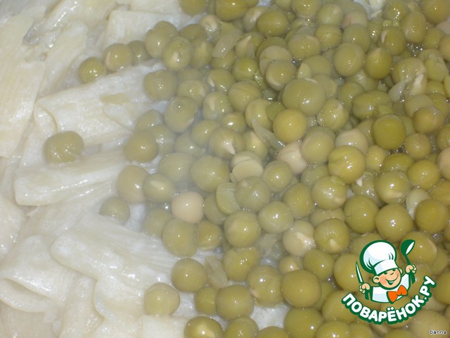 Когда сыр расплавится, выложите к макаронам отцеженный зелёный горошек. Хорошо перемешайте.