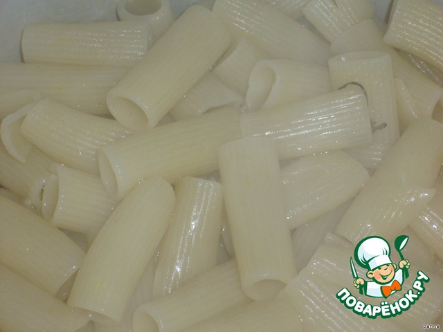 Макароны (любые, какие вам больше нравятся) отварить. Откинуть на дуршлаг, промыть холодной водой и дать стечь.