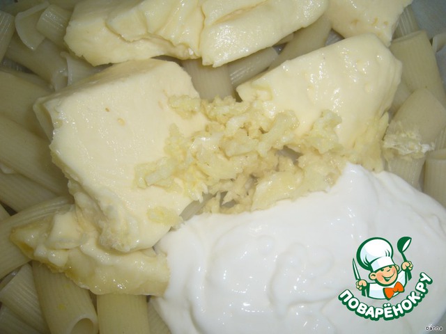Выложить туда же любой мягкий сыр, сметану, майонез, добавить выдавленный прессом чеснок. Поставить на маленький огонь на рассекатель и помешивать до тех пор, пока сыр полностью не расплавиться - на это потребуется примерно 3-5 минут.