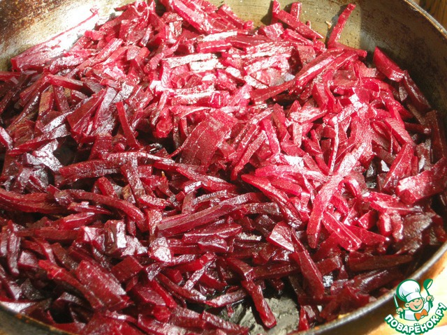 Вареную свеклу порезать брусочками, обжарить, в свеклу добавить уксус по вкусу или сок лимона, соль, сахар (обязательно!) по вкусу, где есть кислота, там должен быть и сахар!